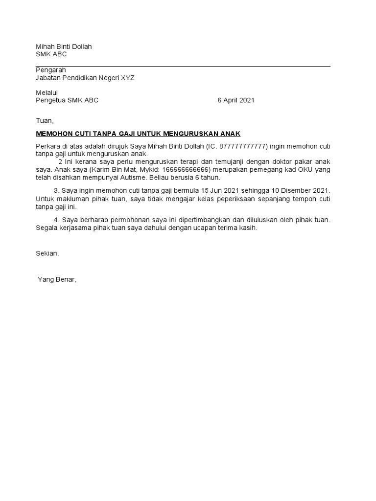 16 contoh surat cuti kerja guru dalam. 14 contoh surat cuti tanpa gaji kerajaan. Surat permohonan cuti tanpa gaji menjaga anak 6.
